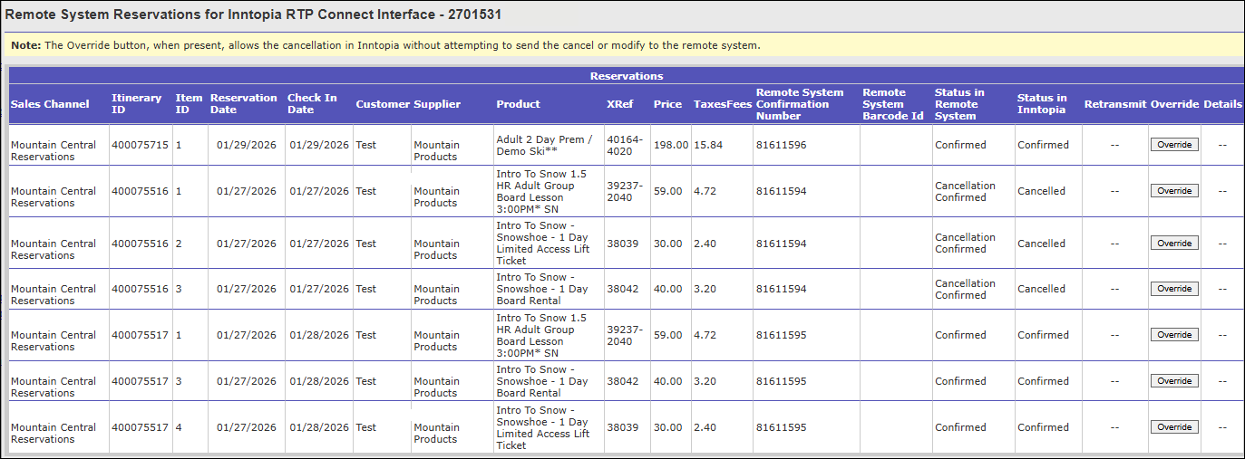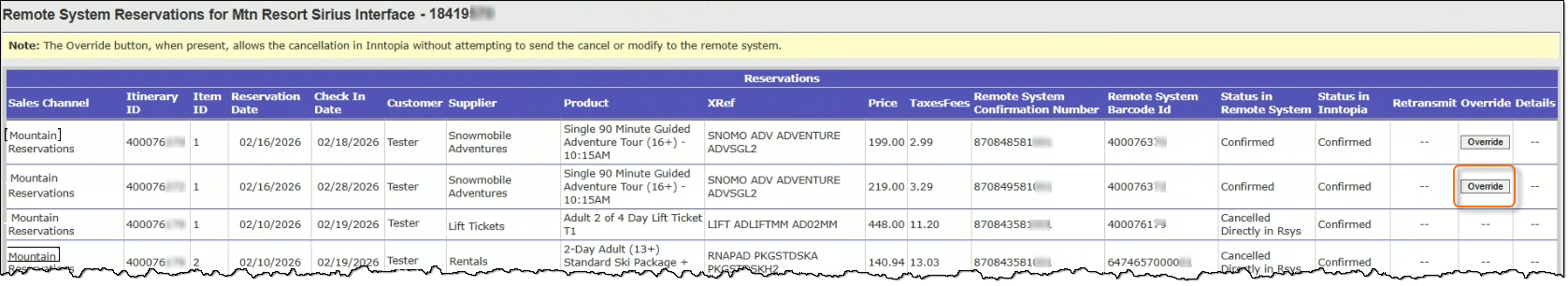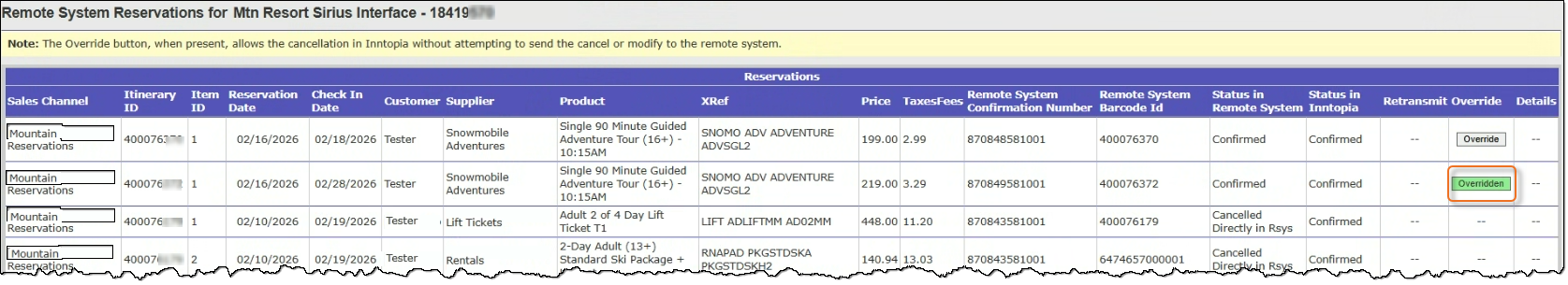 - An Override button appearing in the Override column lets a user cancel a remote-system reservation in Inntopia only (it does not send the cancel to the remote/external system).